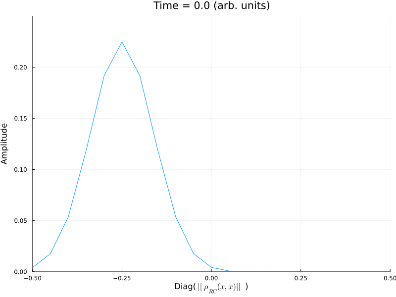 plot(xlist_rho, abs.(diag(ρx[:,:,t])), title="Time = $k (arb. units)", xlabel=L"Diag( $||\rho_{RC}(x,x)||$ )", ylabel="Amplitude", xlims=(-0.5, 0.5), ylims=(0,0.25),legend=:none)