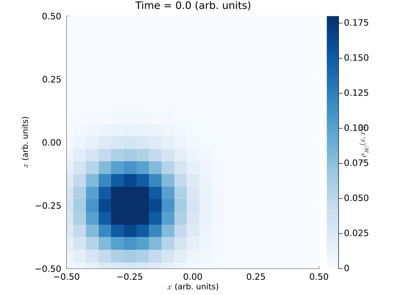 (plot(heatmap(xlist_rho, xlist_rho, abs.(ρx[:,:,t]), c=:Blues ), title="Time = $k (arb. units)", xlabel=L"$x$ (arb. units)",ylabel=L"$x$ (arb. units)", tickfontsize=(12),colorbar_title = L"||\rho_{RC}(x,x)||", legend=:none, xlims=(-0.5, 0.5), ylims=(-0.5,0.5), clims=(0,0.18),aspect_ratio=:equal))